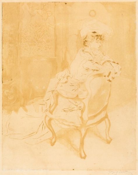 Curator: Here we have Jacques Villon’s "La Parisienne (2)," created in 1902. It’s a stunning etching, capturing a moment of quiet introspection. Editor: There's a fragility here. It's a fleeting moment rendered in ink. The woman seems weighed down by her ornate attire, a visible manifestation of societal expectations. Curator: Indeed, the materiality of the print itself contributes to this effect. The fine lines, the delicate shading achieved through the etching process, creates a sense of ephemeral beauty, yet controlled structure, emphasizing shape and texture, an intricate dance between positive and negative space. Editor: I think Villon is also hinting at the confines of gender at the time. Parisiennes, expected to be paragons of fashion and grace, were simultaneously imprisoned by these roles. Note the almost claustrophobic space around her, accentuated by the cluttered interior objects, the ornate vase, the framed details in the background—as if those material forms also confine and judge her from afar. Curator: The composition is noteworthy too. The gaze is drawn initially to the seated woman and then led by diagonals out toward those background artifacts, establishing relationships within the framed visual world. What kind of symbolic reading could we establish when discussing her interiority? Editor: Exactly. What is it we want her to consider as she gazes distantly out of frame, the unachievable, or a life lived beyond the patriarchal structures of Parisian society? She may be contemplating escape—not a literal one, but one within her mind. She's not empowered—and this is telling, I believe. She represents the constraints on women of the era. Curator: It's a very potent representation of early 20th-century societal constraint, even in such an apparently tranquil etching. It would be interesting to compare this to other portraits of Parisian women to understand her placement within social hierarchy based on pose alone, based on dress alone. Editor: Yes, placing the artwork in conversation with social norms helps unlock it. Ultimately, the strength of the artwork lies not only in its delicate craftsmanship but in its invitation to explore those historical power dynamics. Curator: Absolutely. “La Parisienne” becomes more than just a portrait; it's a visual portal. Editor: Right, to considering the stories of countless women and how these norms influenced them. It's an act of visual archaeology, unearthing the layered meanings of art within society.