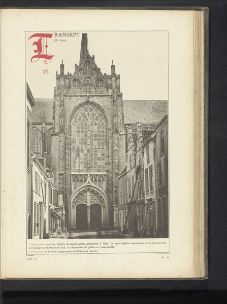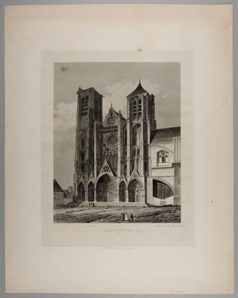 Editor: So, this is Léon Auguste Asselineau's "Zicht op de façade van de kathedraal in Bourges," dating back to between 1856 and 1858. It's a print, an etching and engraving. There’s something so… intense about the level of detail, yet the mood feels almost serene. It gives me a melancholic and solemn vibe, like staring at a grand but slightly fading memory. What's your take? Curator: Melancholic, yes! But I feel a certain groundedness too, maybe in how the realism of the Romantic style brings the cathedral into our space. Look at the lines – aren't they fascinating? Like whispered secrets of time, capturing not just form, but the feeling of the city embracing its magnificent centrepiece. Does it prompt you to question who lived their lives in relationship with this sacred architectural phenomenon? Editor: I can see that. The tiny figures down below really emphasize the sheer scale of the building, like we're peering into the past and feeling the weight of history. How does this blend of Romanticism and Realism speak to that historical context? Curator: The romantic spirit sought to recapture feelings and intuitive reflections – realism sought to ground expression. The people? The façade's presence? They lend to a profound dialogue of existence with what we touch – our legacy embodied in this space. Maybe our memories cling to such places… Don’t you agree? Editor: That makes so much sense, the personal and historical interweaving. It is like looking into the soul of the place and perhaps the artist. Curator: Precisely. The longer I look, the more it invites a dialogue between my soul, Asselineau’s soul and this magnificent monument's history. We must embrace these whispers…they enrich our appreciation of everything! Editor: Well, that definitely gave me a deeper perspective. I really appreciate the fresh lens! Thank you.