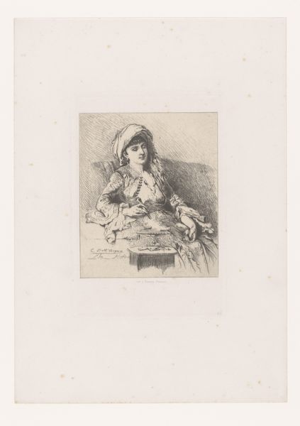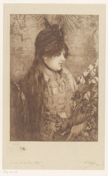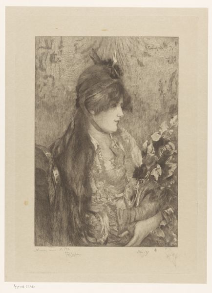 This is an undated etching by Frans Lauwers, portraying an unknown young woman with a bouquet of flowers. The bouquet she holds isn't merely decorative; it's laden with symbolism. Flowers, across cultures, often represent transient beauty, love, and remembrance. Consider Botticelli’s "Primavera," where Flora scatters blossoms, symbolizing renewal. Here, the young woman’s embrace of the bouquet evokes similar themes. This motif echoes through art history, reappearing in vanitas paintings as a reminder of life’s ephemeral nature. But look closer—the flowers also signify a personal connection, a private world of emotions. This resonates with our own memories and experiences. The act of holding flowers becomes a powerful gesture, transcending time, and engaging us on a profoundly human level. We’re left contemplating the cyclical nature of life and beauty.