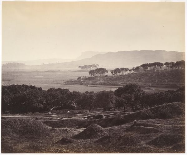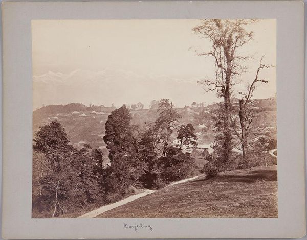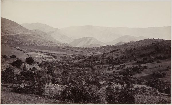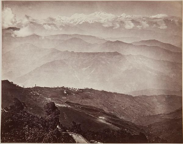 Editor: This is "Darjeeling; View from Leebong, Looking Towards the Snowy Range" by Samuel Bourne. The varying tones create such depth. What visual elements strike you most? Curator: The meticulous gradation of light and shadow is quite compelling. Bourne's manipulation of tonal values creates a sophisticated interplay between the foreground foliage and the distant, ethereal mountains. Note how the textures, from rough to smooth, enhance spatial recession. Editor: I see what you mean. Curator: Indeed, the compositional balance, achieved through the strategic placement of dark and light areas, leads the eye through the landscape. Do you observe how the arrangement directs our gaze? Editor: Yes, I see it now. Thanks for pointing that out. Curator: My pleasure. The photograph's strength lies in its formal structure, revealing an impressive command of photographic technique. Editor: I'll definitely look more closely at those aspects in the future.