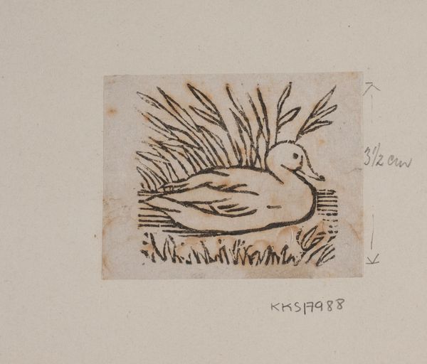 Editor: So, this is "En and" by Joakim Skovgaard, created sometime between 1865 and 1870. It's a small print, a woodcut in ink on paper, currently at the SMK. It’s simple, almost like a little emblem. What’s your take on it? Curator: Well, immediately I’m drawn to the raw quality of the woodcut. Think about the labor involved. The artist is literally carving away material to create the image. It isn’t just about representing a duck; it's about the physical act of production and what that says about artmaking in that period. Does it look more like a craft object than fine art, at first glance? Editor: It does, yes. It seems so...humble, somehow. But does the medium, a print, complicate that reading? Curator: Absolutely. The printmaking process allows for reproduction, distribution. We need to consider the socio-economic implications. Who had access to these prints? Were they disseminated widely? Was this a way to bring images, even art, to a broader audience beyond the elite? Also, consider the line work—stark, functional. It serves a purpose, representing form efficiently, and speaking to functionality rather than aestheticism. Editor: I see. So, it's not just about the duck itself, but also about the *how* and *why* of its creation and distribution, and what the inexpensive materiality would allow. Is that right? Curator: Exactly! We should investigate the type of paper used. Is it mass-produced? Was it intended for high-quality artworks? These "minor" details can change how we perceive it. The "duckness" is just the beginning. The materials and production speak volumes about artistic intentions and social possibilities in 19th-century Denmark. Editor: That’s really given me a different way to see something that I initially saw as so simple. It makes you think about what other 'craft' artworks we may miss the significance of in their materials. Curator: Precisely! Art, in a way, becomes a document, not just to be observed, but to be studied.