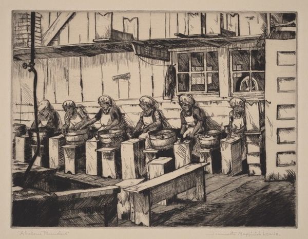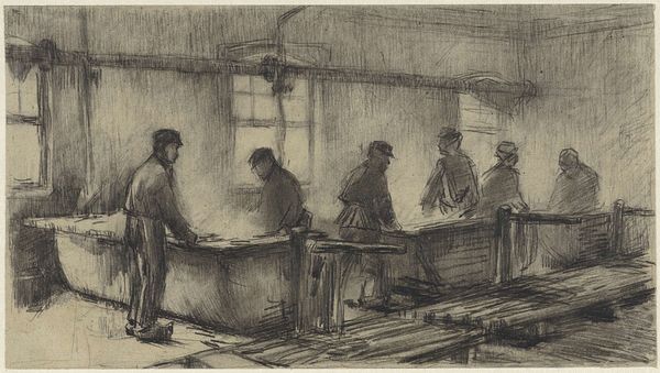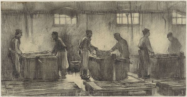 Anthon van Rappard made this drawing of cotton mill workers using pencil on paper sometime in the 19th century. It depicts labourers at work within the confines of a cotton mill, likely in the Netherlands, where Rappard lived and worked. The scene is rendered in stark lines, emphasizing the repetitive and physically demanding nature of their labor. The muted tones and cramped composition evoke the harsh realities of industrial work. The architecture looms over the workers, dwarfing them. The artist's interest in depicting the working class reflects a broader trend in 19th-century European art, in which Realist artists focused on the lives of ordinary people as a commentary on the social structures of their time. By looking into the institutional history of cotton mills we might understand more about these working conditions. This artwork serves as a powerful reminder of the social and economic forces that shaped the lives of countless individuals during the Industrial Revolution.