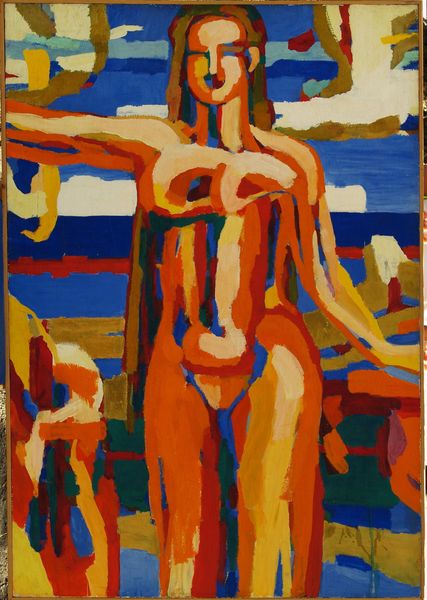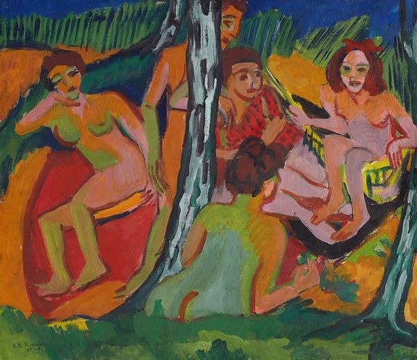Editor: Here we have Paul Ranson’s "Untitled" tempera on canvas, dating to around the 1890s. It strikes me as quite… theatrical. The figures seem posed, and the colors are so vibrant. How would you interpret this work through a more analytical lens? Curator: The most compelling aspect of this work lies in its manipulation of form and color. Notice how Ranson uses flattened planes and bold outlines, reminiscent of cloisonnism, to delineate the figures and landscape. It forsakes naturalistic representation for an emphasis on surface design. Observe the sinuous lines of the vegetation in the foreground contrasting with the angularity of the figures. Does this deliberate juxtaposition evoke any particular feeling? Editor: It creates a certain tension, a visual discord. The flowing lines seem almost organic, while the figures feel more rigid and imposed upon the scene. Curator: Precisely. Ranson, a member of Les Nabis, deliberately pursued a synthesis of subjective emotion and decorative aesthetics. Consider also the interplay between the cool blues and greens and the warmer oranges and yellows. How does this contribute to the overall composition? Editor: The color contrast certainly adds dynamism. It keeps my eye moving around the canvas. It's a constructed reality, not a mirrored one. Curator: A crucial distinction. Ranson isn’t aiming for mimesis. The painting functions as an arrangement of formal elements, each contributing to a self-contained aesthetic experience. Editor: That’s incredibly insightful. I was so focused on the narrative, I almost missed the powerful visual relationships within the work. Thank you for guiding me through that. Curator: Indeed. The artwork offers us more than simply what it depicts. By carefully analyzing the formal devices, we start to unlock more about how meaning is being made.