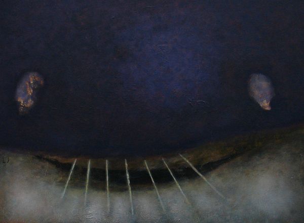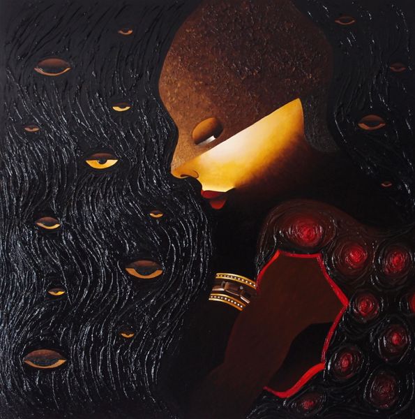 Editor: We’re looking at "Nothing Is What It Seems V," an acrylic on canvas painting by Paulo Tercio from 2014. It’s an intriguing piece featuring two stylized birds against a very dark background. The mood feels confrontational, almost adversarial. What do you see in this piece? Curator: The title itself acts as a crucial key, doesn't it? The birds, presented almost as symbolic figures, draw upon deeply rooted associations. Notice the bird on the right: the stark, geometric redness, adorned with what appears to be an ornate collar, even a kind of armour. What might that armour symbolize, culturally and perhaps personally, to the artist? Editor: Protection? Power? Maybe even vulnerability disguised? Curator: Precisely. The artist may be drawing upon an archetypal language here. Birds have long served as potent symbols. In many cultures, they are messengers, embodying freedom, spirituality. But Tercio seems to be actively subverting those expectations. Consider the other bird, the textures around its eye suggest anger, the focus is palpable. It evokes something beyond the surface. Are these simply birds, or are they reflections of internal conflicts? Editor: It's interesting how the artist uses a common image like birds to represent something so complex and, as the title suggests, perhaps misleading. I was drawn in by their strangeness. Now I’m considering the psychological weight of those shapes and colors. Curator: Yes, it moves us to consider symbols we inherit or presume we know, encouraging reflection upon the possibility they mask unseen dimensions. Editor: I’ll never look at a bird the same way again.