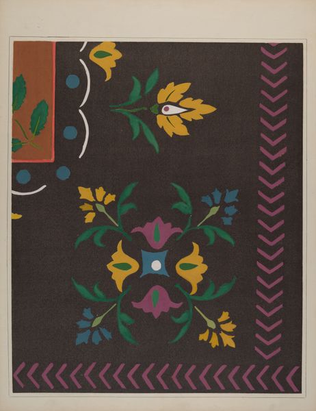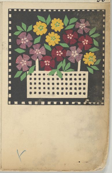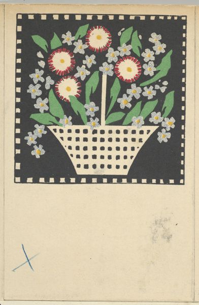 Curator: This is Leopoldine Kolbe's "Basket of Flowers," created in 1907. Kolbe worked in several graphic mediums including linocut, woodcut, and others which you can find represented in the collection of the Metropolitan Museum of Art in New York. Editor: My first thought is how incredibly modern it feels, even now. The colors are vibrant and the geometric composition is surprisingly bold. Curator: Indeed. Kolbe created this piece amidst the blossoming Art Nouveau movement. We see clear connections to that context; prints, drawings, and graphic arts held significance for democratizing art during this period, becoming widely accessible through various publications and decorative uses. Editor: Absolutely. The solid blocks of color are interesting. The eye jumps between the red and white of the flower, set against yellow sprigs, bright green leaves, all sitting on a patterned black background, that contrast really pops! The formal arrangement presents something both primitive and modern. Curator: And within this apparent simplicity lies careful craftsmanship. Consider the influence of Japonisme in the flatness of the image, the use of strong outlines, and the focus on decorative pattern. Editor: Tell me more about that, the basket particularly seems very patterned in nature and it draws the eye from one square to the next. Curator: That basket becomes less about spatial illusionism and more about pattern, integrating as an aesthetic design. And that itself speaks to shifting aesthetic values. Editor: It's fascinating how an ostensibly simple basket of flowers can reveal so much about the broader cultural context. I see much more in this artwork now. Curator: It really provides a focused instance through which we can consider a network of influence within art production. Hopefully you now feel encouraged to revisit your preconceptions.