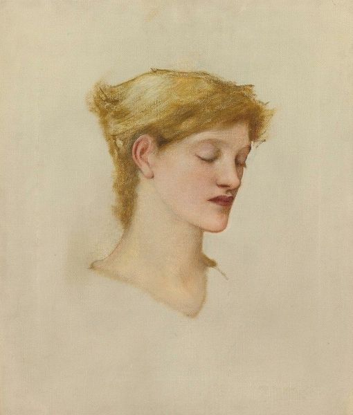 Curator: Before us hangs "Kopf eines träumenden Mädchens," which translates to "Head of a Dreaming Girl," attributed to Gabriel von Max. Editor: It's quite striking. The softness of the palette and the relaxed pose evoke a dreamlike quality, almost otherworldly. Curator: Indeed. Notice the delicate brushwork and the luminous quality of the oil paint, especially on her skin. It invites reflection on innocence and beauty as symbols. What do you make of the bare shoulder? Editor: Well, immediately I think of the models Max would have engaged with – what were their working conditions like, were they also artists in their own right? The pose isn't inherently sexualized, yet it teeters on that line because we are seeing only a portion of the girl, the rendering of her flesh. There is such an uneven power dynamic happening between the artist, subject and viewer here that can't be ignored. Curator: It reflects the prevailing Romantic sentiment and idealized femininity of the period, focusing on an inner state of contemplation rather than explicit narratives, what did the symbolism of maidenhood and dreams carry during that time? Editor: But the dream state also serves as a shield, right? It obscures the real lives of these young women, transforming labor into, in a sense, leisure, where there is a blurred vision between dreams and reality; between idealised women versus lived ones. We only see a sliver of that complex production. Curator: The "dreaming girl" motif suggests a cultural fascination with the subconscious. I find the delicate details and soft tonality give the artwork an emotionally rich and psychological depth, don’t you think? Editor: Yes, it's impossible to ignore the level of artifice at play through paint application, layering to develop and obscure the very subjecthood of a working-class girl, especially because, let's face it, if the materials weren't properly sourced or prepared, the entire image would collapse, fade and even crumble over time. The permanence in what the paint should do is constantly working against reality. Curator: Interesting, so you find the transience of reality pressing at the seams of a more timeless image. I guess this points to a great example of the push and pull between the physical world and that of symbol-laden artistic intentions. Editor: Precisely. And on my end, reflecting on our social structures and artistic practices today helps sharpen that picture for me.