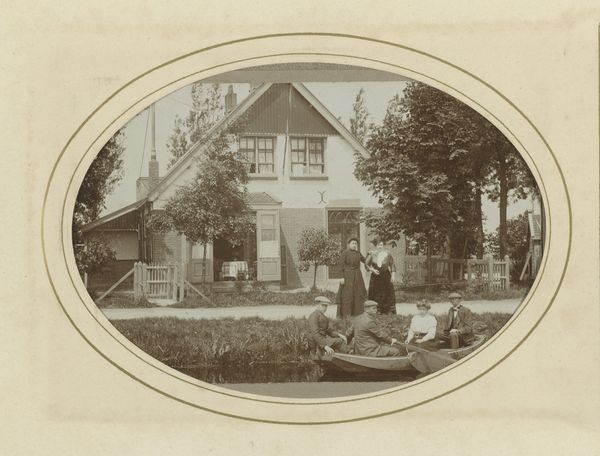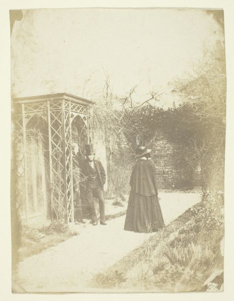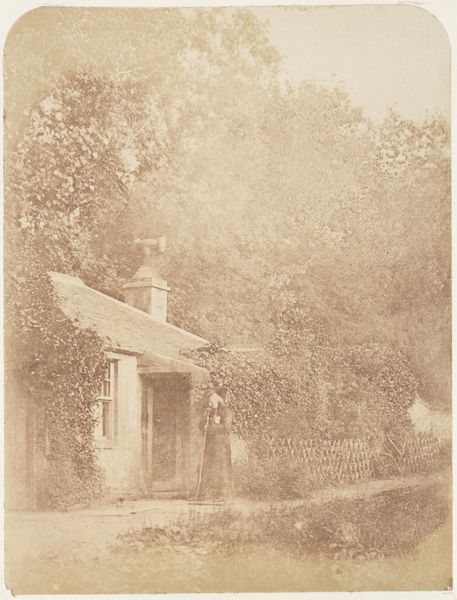 Editor: Take a look at this rather lovely photograph! "Mrs. Craik in Outdoor Garden," dating from around 1848 to 1860. What stands out to me is the very staged contrast between the laboring man with the rake, and Mrs. Craik framed passively in the doorway of what seems to be an English cottage. What kind of social dynamics might be in play? Curator: It’s fascinating, isn't it? The piece is certainly evocative of the socio-economic structure prevalent in Victorian England. Think about photography's emergence at the time. Who had access? Who was being represented, and how? A garden wasn't just a place for leisure. It reflected a family's status, wealth, and control over nature itself. How do you read that power dynamic as expressed through gender and labor in the piece? Editor: I think what you're getting at, Curator, is how gardens reflect privilege. But couldn't we argue that photography also provided opportunities for those who weren’t typically represented in art to be seen? It democratizes representation, doesn’t it? Curator: In theory, yes, but let's look at it more closely. Mrs. Craik's deliberate placement, the carefully arranged garden, and the laboring figure– aren't these curated elements reflecting and reinforcing a certain societal order? Perhaps even reinforcing who "deserves" to be photographed and how. Whose narratives are considered important enough to record? Editor: So, beyond the surface, we're actually looking at the politics of visibility in early photography. The apparent tranquility masks layers of social and economic stratification. Curator: Precisely. Understanding that relationship changes how we see not just this image, but the whole medium itself. Editor: That shifts my perception entirely. I'll certainly look more closely at similar portraits going forward!