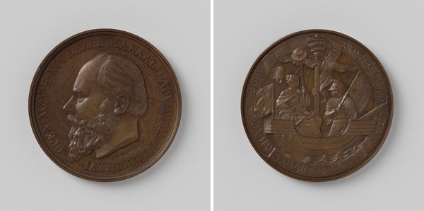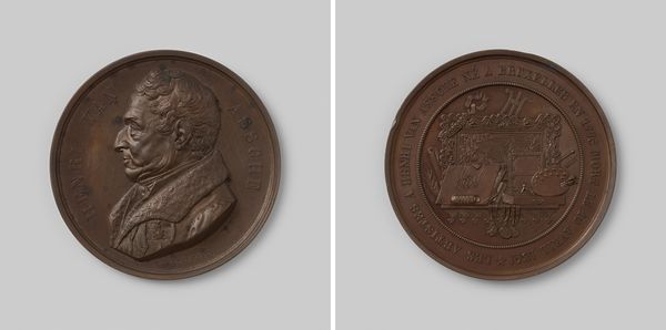 Curator: This bronze relief, created in 1867, commemorates Jacob Baart de la Faille's 50th anniversary as a doctor. Editor: The solemnity of the imagery really strikes me— the figures have such a formal, almost distant quality to them. Curator: It certainly reflects the academic art style of the period. We see a portrait of Jacob Baart de la Faille on one side and an allegorical scene on the other. The materials and method of production tell us much about this object as an artifact: bronze was the dominant material of its time, so it feels rooted in very particular production capacities, modes of labor. Editor: Absolutely, and those historical layers are so rich. Consider the visual language employed on the relief's reverse—it speaks volumes about the values and belief systems operating at the time. It's not just a celebration of academic achievement; it's an assertion of particular social values. The rendering of the nude kneeling person really emphasizes the position they were in, on the edge of what the society accepts as necessary, and begging. Curator: And what of the function of the relief itself? The minting of bronze objects, whether medallions, medals or statuary played a central role in public sculpture. What were people consuming and what types of materials did people think was the perfect thing to produce? This example is very formal. It's not about art for art's sake. It memorializes the contributions of individuals in this format, so a very accessible consumer model was crucial. Editor: And how those achievements are framed historically is significant. The imagery actively constructs Jacob Baart de la Faille as a certain type of authority figure, with that visual, hierarchical relation to this more 'average person'—which may have had implications depending on that particular population being affected by these people. Curator: By exploring the methods of producing, and consuming materials in relation to public identity we start to see a very clear example of that time's value and class structure, as something accessible to every consumer. Editor: It's a small object but it certainly contains a lot about the society of that time. Thanks to the way in which he can continue his work.
