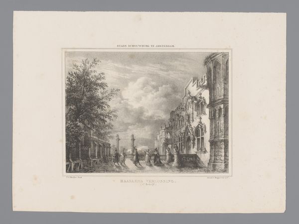 This is a reproduction of an earlier print by Balthasar Berckenrode, depicting the courtyard of the Abbey at Middelburg. It was made by the van Straaten brothers. The image is an etching, a printmaking process that involves using acid to cut lines into a metal plate. This is skilled work, demanding control over the corrosive action of the acid. Look closely, and you can see how the quality of the line varies, creating areas of shadow and light. Prints like this one were essentially a form of mechanical reproduction, allowing images to be widely circulated and consumed. The scene shows a bustling courtyard filled with figures, giving us a glimpse into the social life of the time. The labor involved is not just the van Straaten brother's - it includes the skilled labour of the original artist Berckenrode, whose composition they copied. This print blurs boundaries – not quite a fine art object, but a multiple, made with considerable skill. It's a window into the social context of the 17th century, and the labor involved in image-making.