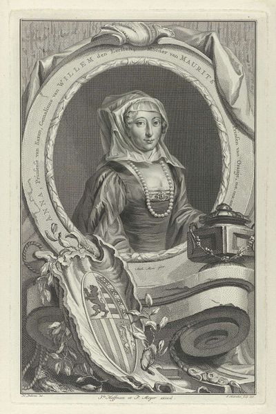 Editor: Here we have Jacobus Houbraken's "Anne of Cleves, Queen of King Henry VIII". The composition is striking, especially with the circular frame and the cherubic figure below. What stands out to you in terms of its formal elements? Curator: Note the circular structure framing Anne, juxtaposed with the angularity of the crown below. The artist uses line and texture to create contrast. How do you read the relationship between these shapes? Editor: I see the circle as a symbol of royalty, perhaps, enclosing her status, while the cherub playing with the crown suggests a fleeting power? Curator: Precisely. It is in the interplay of such forms that we discern Houbraken's commentary. The stark lines also lend a sense of detachment, wouldn't you agree? Editor: Yes, the detail is incredible, and the contrast between the softness of Anne's face and the rigid frame is very compelling. Thanks for pointing out these visual dynamics! Curator: My pleasure. Formal analysis allows us a deeper appreciation of the artist's choices.