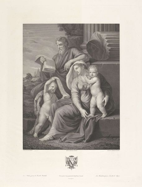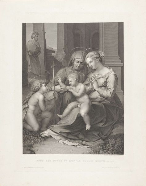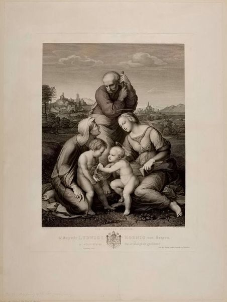 Editor: This print is called "Holy Family of the House of Canigiani" by Samuel Amsler, and it's at the Harvard Art Museums. It feels so serene, like a peaceful snapshot. What do you see in this piece? Curator: It feels like a memory, doesn't it? The gentle figures, the hazy landscape. Amsler captures a feeling more than a literal scene. Joseph's quiet contemplation, Mary's tender gaze – it's all about the internal world. Editor: So, it's less about historical accuracy and more about emotional truth? Curator: Precisely! Like a whispered secret, this print hints at something deeper, something intensely personal. Editor: I never thought of it that way. I was so focused on the religious aspect, but now I see the intimate family moment. Curator: Art is a mirror reflecting our own souls, isn't it?