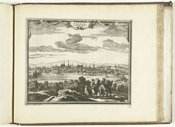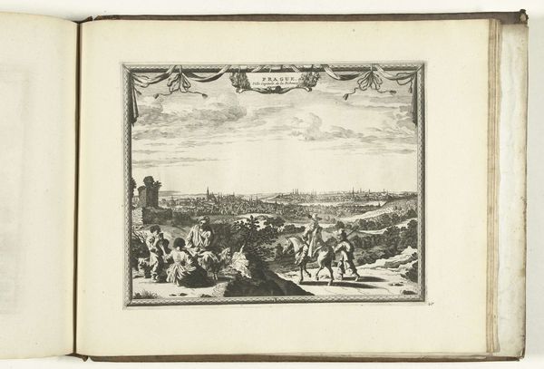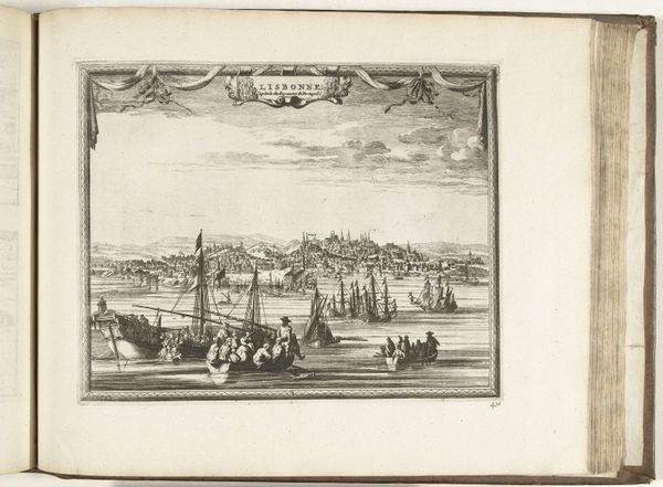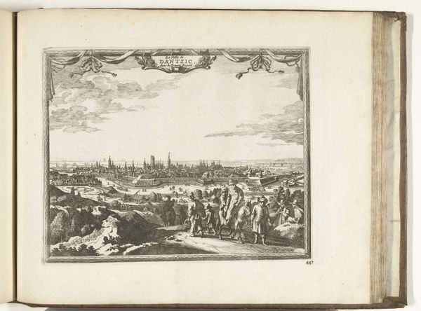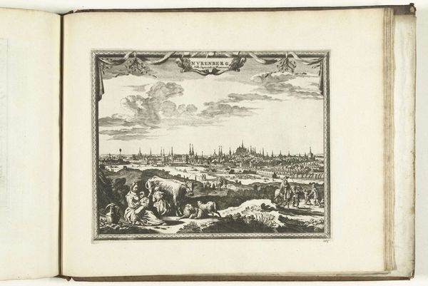 Editor: Here we have "Gezicht op Mainz," or "View of Mainz," an engraving on paper from 1726. What immediately strikes me is the incredibly fine line work used to create this panoramic cityscape. How do you approach interpreting a piece like this? Curator: Considering this print's production, we can think about how this image functions within a specific social and economic system. The detailed engraving, multiplied and disseminated, speaks to the rise of print culture. Its materiality – the paper, the ink, the engraved plate – and the labor involved, highlight a shift in how knowledge and representations of places were circulated. Was this print intended for a wealthy patron, a merchant, or a wider public audience? Editor: That’s a good question. The detail does suggest a wealthier buyer. But were prints like this also used for more practical purposes, say, in trade or urban planning? Curator: Precisely. The cityscape as a genre becomes incredibly popular. So thinking materially, these prints provided not just aesthetic pleasure, but also practical information. It may have also fueled trade and commerce in Mainz itself. This image both reflects and shapes the urban experience of its time. Look at the frame around the image. What do you think about it? Editor: I guess that I had assumed the frame was only there to delineate the image on the page. However, I see that it’s part of the plate itself. It feels so deliberate. Almost a sign of luxury, but maybe also simply to protect the image on the plate. Curator: Exactly. Everything you mentioned reveals social contexts related to this artwork. Perhaps it's the image as luxury object. Or perhaps it’s also meant for something much more ordinary, like framing the image’s subject to give a specific viewpoint of what one might think about when contemplating urban development. Editor: This really changes how I see this print. Thinking about the materiality and social context reveals so much more than just the image itself. Thanks for highlighting that! Curator: Absolutely! It’s about uncovering the stories embedded in the very substance of the artwork, shifting how we define labor and consumerism that underpins artistic creation itself.