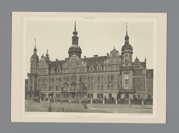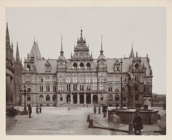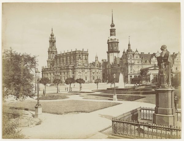 Editor: Here we have a rather stately image, titled "Horse and Carriage in front of Amsterdam Central Station," created by Hendrik Herman van den Berg sometime before 1894. It's a daguerreotype, a very early form of photography, depicting a bustling cityscape. It almost feels like stepping back in time, doesn’t it? What stories do you think this photograph whispers? Curator: Whispers, yes, exactly. I imagine a day of crisp air and horse-drawn carriages. It evokes that quiet hum of a city just beginning to embrace modernity, doesn't it? The architecture speaks of a burgeoning neo-classical era, while the horse-drawn carriage and the blurry figures remind us that technology has a bit of catching up to do, a poignant sort of time capsule, wouldn’t you agree? The rigid neo-classicism contrasted against this early moment of photography - the contrast delights me. Editor: It’s funny you say blurry! I was wondering about the long exposure time required for daguerreotypes – is that why the people are a bit ghost-like? Curator: Precisely! Think about it: the photographer coaxing stillness from life in motion. How romantic! It reveals so much about the era's limitations *and* its ambitions. I see an Amsterdam on the cusp, self-consciously posing for the future. Does that change how you see it? Editor: Definitely. I was so focused on the building itself, I missed the ambition. I’ll remember that, next time I want to study it from another perspective. Thank you! Curator: My pleasure! Always consider *not only* the what, but the *why* and *when*, and *who*...the picture evolves each time.