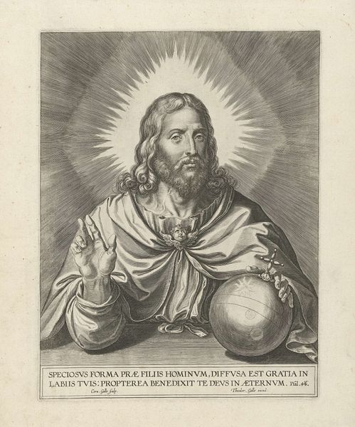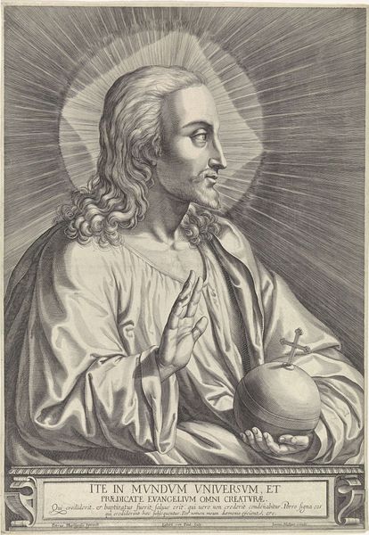 Curator: Look at the weight in those lines, that texture. This engraving, "Christus met rijksappel," produced sometime between 1585 and 1692, portrays Christ holding an orb surmounted by a cross—the "rijksappel" or globus cruciger. Editor: There’s something surprisingly stern about his expression. You know, considering the iconography we usually associate with depictions of Christ, this portrayal feels…imposing. Almost judgmental. Curator: The artist, regrettably anonymous, used the medium of engraving to achieve this incredible detail. Notice how the light emanates from behind his head, creating this radiating halo effect. The orb signifies earthly power and dominion. How would such imagery be politically read in its own time? Editor: Well, the placement of that cross right on top certainly suggests that worldly power is divinely sanctioned. In an era defined by religious conflict and reformation, visual cues like these served to reaffirm the church’s authority. To place the cross above all else symbolically placed their authority beyond questioning. Curator: Absolutely. Consider the psychology too, and remember our human perception craves familiar signs in unfamiliar places. This image synthesizes religious authority and secular rule in the viewer's mind through carefully designed iconic markers. The very act of seeing the piece in the Rijksmuseum impacts its meaning for us now. Editor: Right. The Rijksmuseum as an institution, by choosing to display it, subtly reinforces this connection even centuries later. But that sphere… that almost perfect form. Is it truly about dominance or responsibility? A burden, almost, carried in his hands? Curator: Perhaps the artist leaves the door open for both interpretations. After all, the power of a symbol lies in its ability to hold multiple meanings, evolving with the cultures that view it. Editor: Well, pondering the weight of history – and faith – makes you reconsider what power means today. Curator: Indeed. "Christus met rijksappel" speaks volumes about the enduring complexities of belief, governance, and artistic vision.