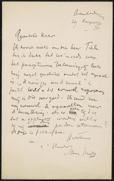 Curator: Here we have "Brief aan Jan Veth," attributed to Isaac Israels, created sometime between 1875 and 1925. It's currently housed here at the Rijksmuseum. What's your immediate reaction to this piece? Editor: Well, initially, it evokes a sense of intimacy and immediacy. It's just a letter, really – ink on paper. I find myself drawn to the raw, unedited process of thought and the physical act of writing itself. It makes me think about the effort involved. Curator: Indeed. Let's delve into that a bit. Consider the composition – the placement of the text on the page, the deliberate hand-lettering. You could interpret the somewhat scattered arrangement and varied line weights of each word as reflective of spontaneous thought processes, right? It disrupts a clear flow. Editor: Precisely! And that's what speaks to its materiality. The paper, the ink, even the pen itself, they are tools employed within the artist’s labor of composing this missive. It humanizes the artwork as an imperfect, and fundamentally human form of communicating with someone he knew and likely loved. Curator: That imperfection is essential. The drawing as a document invites questions. What are the stylistic qualities we can draw upon given his status as a painter who worked across a range of portraiture, impressionism, and landscapes? The use of paper and ink in and of itself gives us very little to hold onto. Editor: Agreed. But I believe looking into that artist’s milieu helps clarify our interpretation, or rather contextualizes its making and utility. In the late 19th-century art world, a handwritten letter held an intrinsic value quite apart from its literary qualities. Curator: A pertinent point. It’s the object itself that then gains value. Not the content of the letter, but as an artefact—a moment in time rendered permanent. Its impact is perhaps strongest in its simplicity and quietness. Editor: Perhaps it demonstrates that true art exists in direct creation: a physical and mental act to touch the lives of others through a common experience we all share as both givers and receivers of the hand-written word. Curator: Ultimately, its compelling effect lies in the immediacy of a passing moment—that intimacy you spoke of earlier. A fragment preserved across time.