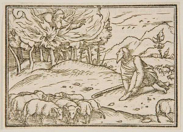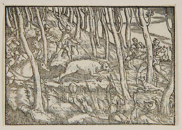 Curator: Let's consider "Cut IV," a woodcut held at the Harvard Art Museums, created by an anonymous artist. Editor: It's immediately striking how graphic it is; the crisp black lines carve out a scene of frantic action, very dramatic. Curator: Indeed. A stag hunt seems to be the subject—men chase after the beast, with one figure pointing towards what seems to be a child in a tree. Editor: That detail is…unsettling. Is it perhaps about innocence threatened amidst the chaos of the hunt? Curator: Possibly. The stark contrast and the stylized rendering of figures lend a dreamlike quality to the piece. The absence of shading adds to the sense of flatness, focusing our attention on the linear storytelling. Editor: It definitely feels like a scene ripped from folklore, where something uncanny is always lurking. I'm left pondering what the child in the tree truly signifies. Curator: Exactly. These details invite us to reflect on the hunt as more than just sport. It becomes a deeper exploration of primal instincts and unexpected encounters. Editor: So, a brief encounter filled with questions and open-ended possibilities. Quite a find!
