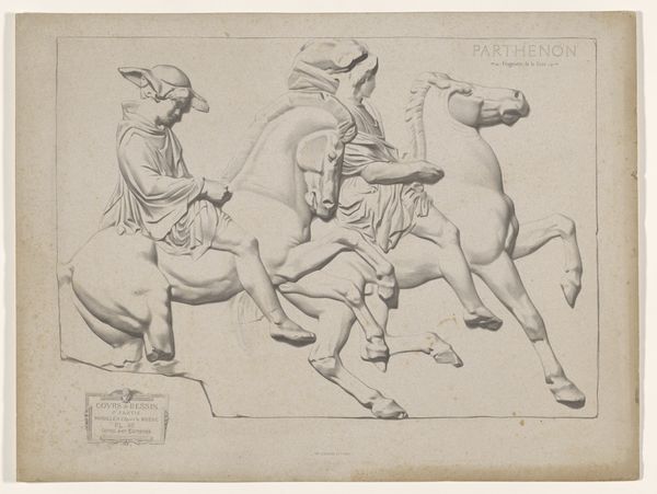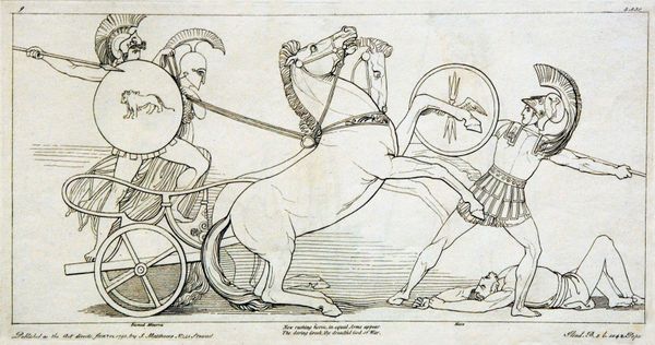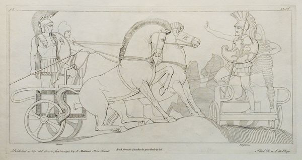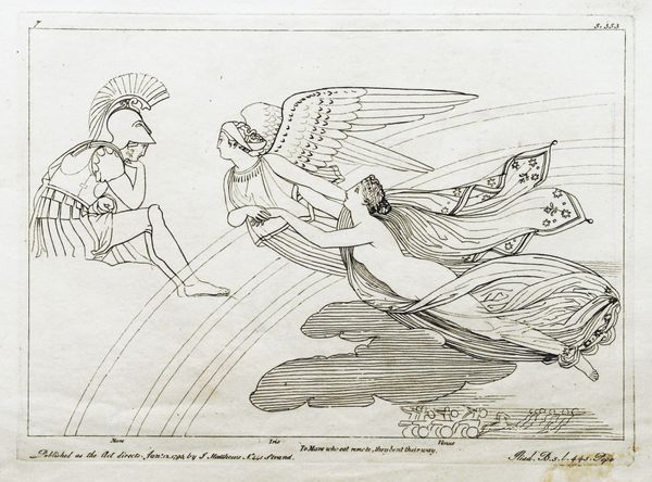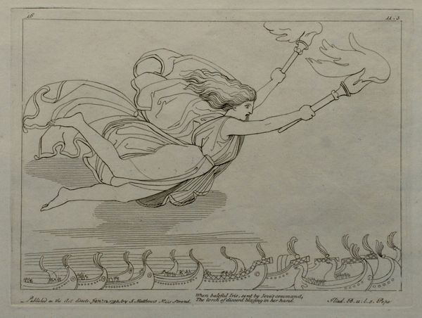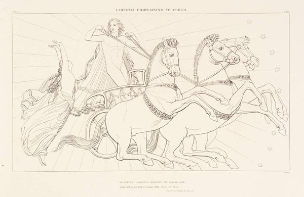 Curator: What strikes me first about this engraving by John Flaxman, titled "Illustration to the Iliad" and created in 1795, is its incredible linearity. Editor: I find it ethereal, almost dreamlike. The figures seem to float rather than move, and the lack of heavy shading adds to that lightness. There’s an almost chaste quality to the scene. Curator: Absolutely. Flaxman masterfully employs line as both structure and suggestion, very evocative. Consider how he uses parallel lines to define the musculature of the horses and the drapery of the figures. This reinforces the work's Neoclassical spirit by simplifying and idealizing forms to emphasize classical purity. Editor: This work carries the potent symbolism of Homer’s Iliad and that era's rediscovery of ancient Greece. We have gods and chariots—timeless visual shorthand for heroism and the divine. It recalls the Roman interpretations of Hellenistic sculptures but flattens and distills the figures. Curator: A very keen observation. Flaxman’s strategic use of white space pushes all of these representational components forward. Look at the precise articulation of the chariot, positioned near the margins of the work, drawing our gaze through each figure, grounding our spatial awareness. Editor: And in contrast, notice how the dancing figures appear less earthly, almost celestial, thanks to their positioning among the stars. Stars in classical iconography represented the divine and immortal nature of heroes or gods. This evokes cultural memories of mythic narratives in the viewer’s mind. Curator: Precisely. The composition invites a dynamic reading. But I would stress the structural rigor within. Flaxman avoids excessive ornamentation to retain thematic clarity. Editor: Overall, the emotional effect is intriguing: restrained yet expressive. Its delicate line work is less about bombastic narratives of war, as often found when visualizing Homer, but a gentler expression of timeless values and moral tales. Curator: An enlightening approach. Considering both Flaxman’s craftsmanship and the engraving's conceptual density leaves me with an enhanced appreciation of how form and content perfectly coalesce in "Illustration to the Iliad". Editor: Yes, Flaxman's minimalist aesthetic is an important historical reference, underscoring a refined moment of looking back to classical traditions and how that visual vocabulary informed future creative pursuits.