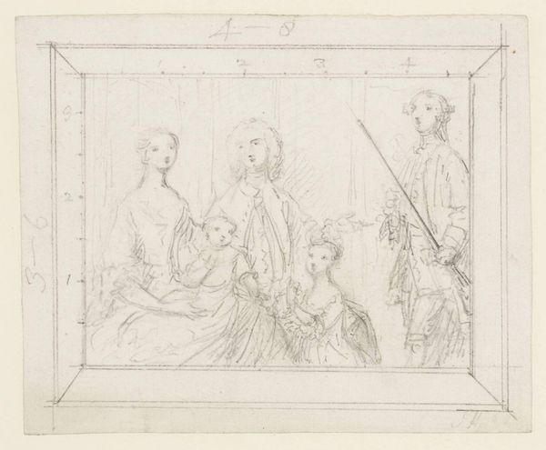 Editor: This is Joseph Highmore’s sketch of a "Family Group of Five Persons," housed at the Tate. I find the composition quite captivating despite its simplicity. What strikes you first when looking at this piece? Curator: I’m drawn to the careful arrangement of figures within the defined pictorial space. Notice the interplay of lines and how Highmore uses hatching to suggest volume and depth. The composition appears to be structured around a subtle diagonal axis, directing the viewer's eye across the family unit. Editor: That's fascinating! I hadn't noticed the diagonal axis. Thanks for sharing. Curator: Indeed. The artist uses the interplay of the figures to direct the gaze. We often overlook these formal structures. Editor: I definitely will pay closer attention to that from now on.