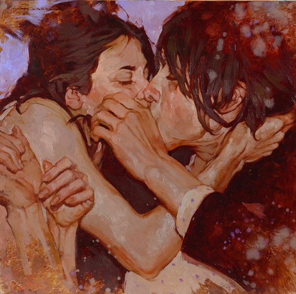 Curator: What a whirlwind of color and texture! Robert Maguire’s “Innocent Fire,” from around 1970, immediately strikes me with its almost feverish composition. Editor: The title itself, "Innocent Fire," certainly hints at the complex, and perhaps contradictory, cultural scripts being enacted here. Given the era, let’s consider this within broader narratives of gender and romance. Curator: Absolutely. Beyond the somewhat conventional subject matter, what’s fascinating is how Maguire renders it. Note the incredibly loose brushwork—almost gestural—especially in the rendering of the landscape around the couple. It creates an almost dreamlike state. Editor: Precisely! This work appears to be rife with symbolic dichotomies, doesn't it? The contrast between the red dress, almost signaling danger or passion, with what could be interpreted as a naive embrace taking place within this somewhat wild, undefined space. Curator: And then, there's the tension between the detailed rendering of their faces versus the abstracted landscape— it's like focusing our attention on the human connection, while acknowledging a blurring, perhaps romanticized, external world. He achieves a sense of dynamism by the deliberate placing of that single horse, far away, in the scene's upper field. Editor: We should consider how these depictions of romance were also commodities. Analyzing the tropes reinforces a critical understanding of how gender and power dynamics operate. Considering popular erotic art conventions may very well give this painting even more layers of meaning. Curator: A powerful point! The materiality itself adds to that romantic feeling, doesn't it? It's all oil paint on a canvas that supports very rapid, evocative application and mark-making. He wasn't afraid to let the brushstrokes show— that's crucial. Editor: Well, and looking beyond the artistic craft for a moment, those brushstrokes help contextualize these artistic depictions, shedding light on both intended and unintended cultural signals embedded within "Innocent Fire." Curator: Exactly, and it makes you question who exactly it was designed to seduce, or for whose idea of romance was this artwork made. Fascinating piece that sparks so many ideas! Editor: Indeed. "Innocent Fire" challenges viewers to dissect its artistry through both a close look and a broader cultural critique.