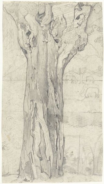 Editor: This ink drawing, "En bøgestamme," or "A Beech Trunk," created by Dankvart Dreyer between 1844 and 1846, captures such detail. The way he rendered the textures, you can practically feel the roughness of the bark. What do you make of the stark lines? Curator: The emphasis here lies significantly in the treatment of form and line. Dreyer isolates the tree, presenting it as a study in shape and texture. Observe how the density of lines varies to create depth and shadow. The drawing style employs a linear approach, yet succeeds in rendering the mass and volume of the trunk with remarkable precision. How do you view his composition? Editor: I noticed how he uses such a limited palette and creates so much depth, though. It's pretty captivating! Is there anything symbolic at play here? Curator: Symbolism might be tempting, given the period. But from a Formalist point of view, what is vital is how Dreyer creates an intimate portrayal through close observation of its materiality. The branching network, the surface details, all underscore a preoccupation with the object itself, independent of external meanings. Dreyer gives us visual information. What significance do you observe within the artwork? Editor: So, rather than looking for deeper meanings, we are supposed to simply observe its form, line, and textures. I see a realism in this. I am intrigued with his emphasis on realism and the romantic style to give the trunk life. Curator: Precisely! By isolating the beech trunk and detailing its textures with ink, Dreyer showcases the artistic merit inherent in form and line. Through that framework, we learn a great deal about what constitutes landscape as a function of nature's structural elements. It really makes one pause and appreciate the structure that makes that beech tree come alive. Editor: Absolutely, and by thinking about composition, Dreyer directs our gaze, our consciousness towards form, nature and structure. Thanks for clarifying that.