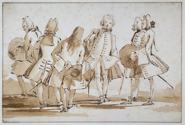 Curator: Look at this vibrant social scene rendered in ink and paper. This is "Concert at the French Consul's Residence in Brindisi" by Louis Ducros, created in 1778, a fascinating peek into the leisurely lives of the Neoclassical period, held right here at the Rijksmuseum. Editor: You know, the immediate thing that jumps out is this understated elegance. A grayscale palette, loose brushwork, a real sense of being 'in the moment', less a formal portrait, more an observational anecdote. It feels remarkably unstilted for a formal concert! Curator: Exactly! Ducros captures a certain cultural resonance here. Music held symbolic significance – it was viewed as a way of cultivating harmony and order, reflecting Enlightenment ideals and the aspiration for an idyllic civilized life, perhaps more hoped for than experienced, judging by those rather restless figures toward the back there. Editor: Oh, the restless ones! Those ghostly background figures seem to echo the more solid figures, they also suggest sound, in that ghostly haze, perhaps also social tensions held in check by social niceties. And this instrument--a lute, or perhaps a mandolin? Adding to that sense of ordered chaos I detect here. Curator: You're spot on, instruments themselves can have cultural memory and meaning! Lutes often evoke associations with romance, poetry, the idealized past... though within the specific context of the Enlightenment, their music was becoming accessible beyond the aristocracy and into the middle classes, a signifier of wealth and cultured sophistication and wider participation in cultural life. Editor: It strikes me, too, that this concert is taking place at a consul's home in Brindisi - an intriguing location, isn’t it? A sort of crossroads, literally a port city for trade and diplomacy. I imagine cultural exchange was very vibrant there at the time and perhaps a Neoclassical expression of 'Europeanness' taking place far from its original borders, as those lines get blurry at the edges. Curator: Well observed! The Neoclassical style often drew its influences from classical antiquity, suggesting cultural aspirations linked back to Rome and Athens in an effort to establish a kind of continuity between their own era and an earlier period. Editor: I love how this simple drawing manages to hold all that complexity... Ducros really invites you into the scene. What begins as a sketch somehow echoes history and resonates with cultural nuances across time. Curator: It's wonderful how, even through the relatively simple composition, it still provides us with a portal into the eighteenth century! It reminds us how spaces have multiple lives.