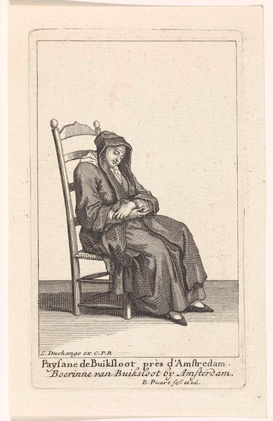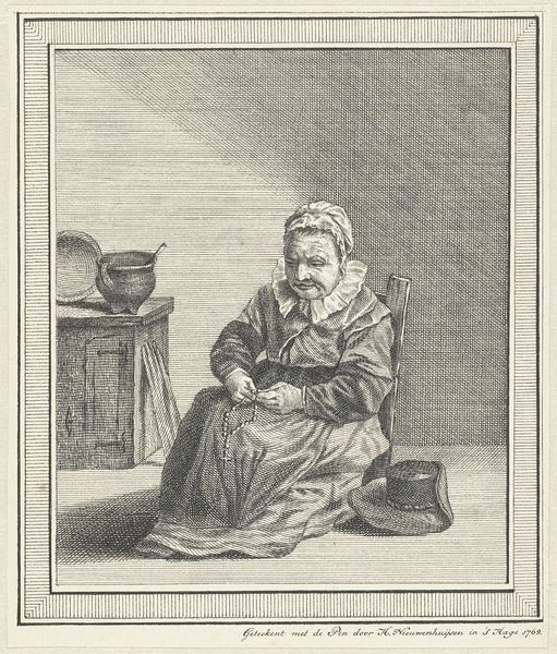 Editor: This is "Zittende oude vrouw met rozenkrans," or "Seated Old Woman with Rosary," an engraving by Hendrik Nieuwenhuysen from 1766, currently residing in the Rijksmuseum. I'm struck by how closely it seems to depict the woman and her aging body. What do you see in this print? Curator: It's a powerful image. I see it as an entry point to discussing the representation of aging women in art, especially during the Baroque period. Note the almost brutal honesty in the depiction, the antithesis of idealised beauty that was so frequently seen in art. Editor: Brúúúúútal? I was going to say it reminded me of someone's sweet Grandma! Is it maybe also a socio-political statement? Curator: Absolutely. The decision to portray the realities of old age and poverty is a direct engagement with social issues. It asks us to consider who is deemed worthy of representation and how society values its aging population. The rosary, usually associated with piety and virtue, also underscores a narrative of resilience. She represents marginalized figures whose voices are often ignored. Editor: So, you see her gaze, the rosary, and her very presence, as an assertion? Curator: Precisely. This engraving challenges us to deconstruct how power operates. Who gets seen? Who remains invisible? The woman’s quiet, dignified presence is a form of resistance, demanding recognition. This piece functions almost as a time capsule of both technique and subject. Editor: Thank you. I would have walked right past it had you not told me. I will certainly see such images from a different perspective from now on. Curator: My pleasure, sometimes, the older it is, the more it can reflect modern struggles!