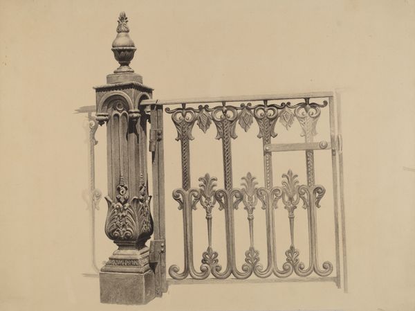 Editor: Here we have Jerome Hoxie's "Gate and Gatepost," likely from around 1940, a drawing done in pencil on paper. The subject seems so straightforward, yet there is a formal quality that gives the drawing such a sense of balance. What do you make of it? Curator: This image invites us to consider boundaries, doesn't it? What do gates symbolize to you? They are physical barriers, yes, but what else? Editor: Well, they’re about entrance and exclusion...access, and who gets it. Curator: Precisely! And think about the details. The finials on the gate and post—do they remind you of anything? They evoke stylized fleur-de-lis, ancient symbols of royalty and, later, religious figures. In Hoxie’s time, they could evoke ideas about class, and what spaces and ideas certain people could access. Do you see this tension between the everyday object and its layered meanings? Editor: I do, especially knowing the date, right before the war. Did that change the interpretation people might have had? Curator: Absolutely! The imagery of barriers, access, privilege... these would have been potent themes as global conflicts escalated and questions of identity and belonging were brought to the fore. Visual symbols take on a renewed urgency, reflecting and shaping collective anxieties. Editor: That's a whole new perspective! I'm going to look at gates differently from now on. Curator: It makes you wonder, what will people see in this image 50 years from now?