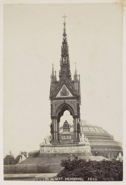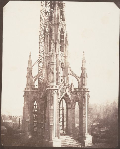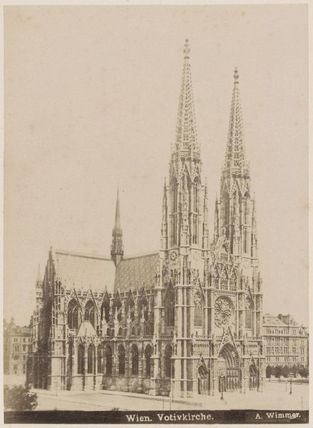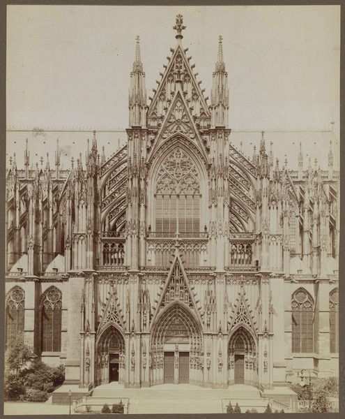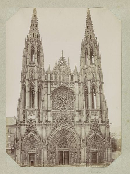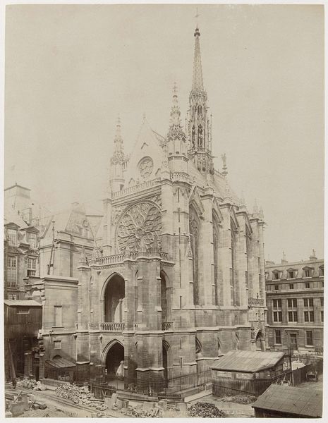 Curator: This gelatin silver print captures the exterior of the Sainte-Chapelle in Paris, sometime between 1887 and 1900. It is simply signed "X phot." Editor: Oh, wow, isn't that striking? It feels like a memory, soft and dreamlike. The cathedral just ascends, almost ethereally, into the sky. The sepia tone gives it that ancient quality. Curator: Indeed. The choice of the gelatin silver process allowed for incredibly fine detail. Note how it captures the intricate gothic architecture—those pointed arches and that soaring spire. Sainte-Chapelle was conceived as a reliquary, a palace chapel that Louis IX used to house the Crown of Thorns. The monarchy inextricably entwined within the structure. Editor: Right, you get the sense of not just the monument itself but its place *in* something – as a very specific manifestation of royal authority. Makes me think about what power even means when it's embodied in architecture. Like, can stone really hold sway? Curator: Well, consider the chapel's location within the Palais de la Cité, the royal residence at that time. Its mere presence reinforced the monarch’s divine right to rule. Photographs like this disseminated that authority beyond its immediate geographic context. Editor: Hmm, a photo turning stone into symbols of power. Is there a change of experience taking place? I mean how is viewing it then or viewing it now, different? For me, now, removed from the historical weight, I'm drawn to the textures – the aged stone and that ethereal quality, it feels like something discovered or recovered from an archive. I also have to wonder who “X phot.” really was? There is such a anonymity of simply 'X'. Curator: That's a really salient question and speaks to the role of authorship in visual history. Photography in the late 19th century democratized image production, opening pathways to participate in its representation of society. Though signed “X phot.”, we’re presented with an opportunity to ponder not simply the artist, but the relationship between the chapel, power and representation. Editor: Precisely. Makes you appreciate the mystery and the multiple layers packed into what might first appear a simple architectural photograph. It feels less like an archival capture, more like an opening into contemplation itself. Curator: Well said. A moment of contemplation fostered by considering both image and context.