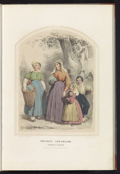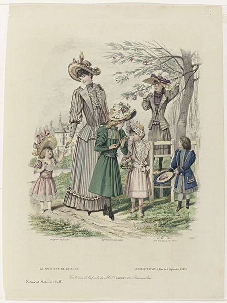 Editor: So, this is "La Mode Illustrée, Journal de la Famille, 1882", created by Firmin-Didot & Cie. It looks like it's made with watercolor and colored pencil. I'm immediately drawn to how the clothing details suggest wealth, but what else stands out to you, from a purely visual perspective? Curator: What I observe is the structured arrangement of the figures. Note the balanced distribution across the picture plane. Consider how the artist uses the varied heights of the children to create a rhythmic effect. How do you interpret the contrast between the intricate wallpaper and the relatively plain clothing of some figures? Editor: It seems like some of the children are being highlighted more through their richer colors. Like the girl in the blue coat and the one in the plaid dress by the table? Is that part of the formal structure, too? Curator: Precisely! Observe the artist's careful attention to the folds and drapes of the fabrics, which add depth and texture. The artist uses color strategically, guiding the viewer's eye, do you agree? The eye travels through their configuration. Notice how the patterns and textures play against the figures, creating a tension between surface and depth. What compositional tools can you identify? Editor: I think the varying tones really enhance the surface qualities and draw you to specific figures within the setting, creating a visual hierarchy in the composition. Curator: And doesn’t that bring forth the visual push and pull which keeps our eyes engaged. Thank you! Editor: That's a different way to look at it, by breaking down all its visual elements. I think I’m starting to get a sense of how analyzing just the art itself helps. Curator: Indeed. The beauty lies in its construction!