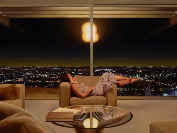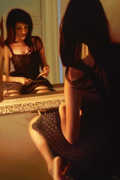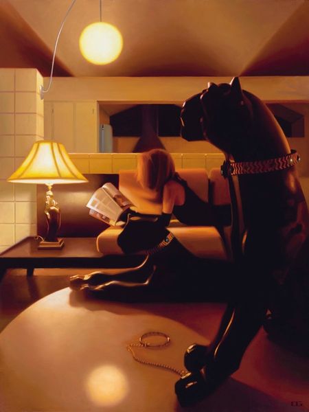 Editor: Here we have "The Kissers," an oil painting by Carrie Graber. What strikes me immediately is its cinematic feel and this tangible sense of intimacy. What’s your take on this piece? Curator: It's interesting you mention the cinematic quality. To me, this painting feels deeply rooted in mid-20th-century domesticity. Consider how popular culture, especially film and advertising, during that period presented very specific ideals of home and relationships. Does this scene feel aspirational to you, or perhaps even staged in a way? Editor: I see what you mean! The setting does seem deliberately curated. The carefully placed furniture, the woman's stylish dress... it’s not just a spontaneous moment, is it? So how might we see that deliberate "staging" of their intimacy? Curator: We could argue it reflects a broader societal pressure of that era to present a picture-perfect image. The painting invites us to consider the constructed nature of relationships, the roles people perform, and how these images are disseminated and consumed. Even their obscured faces suggest a generalized representation of love, rather than an individual story. It is asking the viewer: Who does this couple *represent* to you? Editor: That makes sense! I hadn't thought about the pressure to perform happiness in that way. Does the lack of a specific date for this painting play into that ambiguity? Curator: Absolutely. Without a concrete date, it almost exists outside of time. It's a meditation on how intimacy is portrayed, packaged, and perhaps even sold. It raises questions about the gap between idealization and reality. Editor: I see it now – it is less about this one couple kissing but more about the concept of domestic bliss and the ways it gets communicated and commodified. That's given me a lot to think about! Curator: It’s a painting that encourages us to be critical viewers, not just of art, but of the broader cultural narratives that shape our perceptions of love and life. I'll definitely keep that with me!