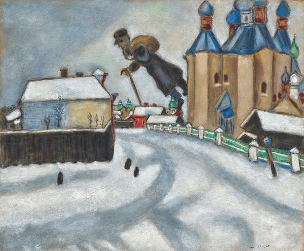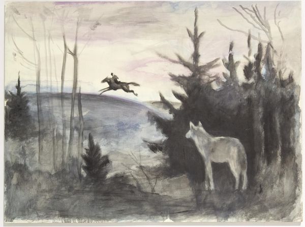 Editor: This is "River Emut in Tungus" by Niko Pirosmani, an oil painting currently housed in the Art Museum of Georgia. There’s something both fantastical and unsettling about the stark composition. What do you make of this, focusing on its visual elements? Curator: Formally, the painting presents a striking dichotomy in its use of light and shadow. The composition is structured around the stark contrast between the almost impenetrable darkness of the forest backdrop and the foreground's snowy expanse and the stark white bear. How do you perceive the arrangement of figures in relation to the picture plane? Editor: I see, so the bear, the hunter, and his striking quadruped mount are placed very deliberately—they are forward and quite exposed. This emphasis draws attention to their action, which is very confrontational given the stark setting, I wonder how the texture, the bear's form, impacts that feeling of unease. Curator: The materiality further emphasizes a primitive aesthetic. The figures are rendered with simplified forms, almost childlike in their execution. What effect does this simplicity achieve in conveying the scene's narrative? Editor: The almost rudimentary rendering paired with the highly contrasting palette creates a somewhat nightmarish storybook scene, which seems rather tragic for the bear, or at least ambivalent toward it. Do you think the subject being a local tale plays into how we view the piece formally? Curator: Cultural context informs the reading, yet it is through formal choices such as stark tonal contrasts, primitive execution, and shallow depth that Pirosmani communicates a compelling narrative. He reduces representational techniques to their bare essence, to maximize expression. It’s the careful, even if naive seeming application that lends a unique presence to his scenes. Editor: So it is these unique stylistic choices, such as form and tonal selection, that elevates this to be more than folk art, imbuing the narrative with greater expressivity. This formal assessment really enriched the way I perceive the work. Curator: Precisely. It underscores how a close reading of an artwork's intrinsic qualities reveals layers of intention and meaning, regardless of its historical classification.