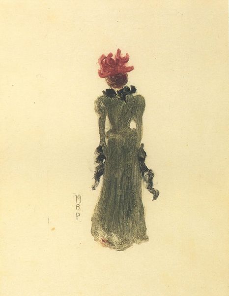 Editor: So here we have "The Red Cape," created around 1894 by Maurice Prendergast, using watercolor and colored pencil – a mixed-media piece, really. What strikes me is the quick, almost rushed application of the paint. What can you tell me about it? Curator: The process is precisely what captures my attention. Notice how Prendergast embraces the inherent qualities of watercolor. It's not about illusionism; it’s about the flow and pooling of the pigment. He acknowledges and celebrates the materials themselves, the very means of production. Editor: So it’s not about accurately depicting a person, but something else? Curator: Exactly! Think about the social context. Impressionism was challenging the established academic painting style that prioritised meticulous detail and illusionistic space. Prendergast’s loose application of watercolor acts as a direct rejection of this established form, embracing the physical act of painting and all that this process means to him. How does his rendering of the 'costume' fit into this rejection of traditional styles? Editor: I see, by using these unconventional materials he’s showing how a cape and dress can be depicted outside the traditional views. Almost celebrating their physical appearance in real life rather than idealized versions. Curator: Precisely! It’s less about depicting a fashionable lady and more about exploring the capabilities of the media he uses. It democratizes the act of image making. We learn a lot about what can be valued outside conventional circles through a material reading. Editor: This really highlights how the choice of material and technique directly informs the meaning, disrupting conventional ideas. Thanks! Curator: Indeed! Examining the 'how' often reveals more than the 'what'. Looking closely at materiality broadens our understanding and helps break down established values.