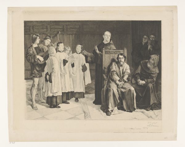 Auguste Danse created this print entitled 'Waanzin van Hugo van der Goes' using etching and engraving techniques. It depicts the late 15th-century Flemish painter Hugo van der Goes during his mental breakdown at a monastery. The image presents a Romantic vision of the artist as a tortured genius, a concept popularized in 19th-century Europe. Made in Belgium, it reflects the rise of historical genre painting and the growing interest in the lives of artists. Danse’s print draws upon art historical narratives and academic artistic traditions. The image also illustrates the 19th-century art world's fascination with psychology and mental illness. We can see the artist in a state of distress surrounded by monks and musicians attempting to soothe him. By examining historical sources, such as Giorgio Vasari's 'Lives of the Artists', we can better understand the stories and myths that shaped the cultural perception of artists. Art is always contingent on its social and institutional context.