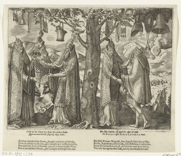Curator: Look at this fascinating piece from around 1570, "De boom der religie," currently held at the Rijksmuseum. It's an engraving by an anonymous artist. Editor: My initial reaction? Claustrophobic! There’s so much happening in such a small space. The dense line work and multitude of figures make it quite intense. Curator: Exactly! The dense composition is typical of Mannerism. This print uses allegory to critique, essentially portraying a "tree of religion" weighed down by corruption. Look at the left— figures representing "Idolatry" and "False Doctrine." Editor: I see that. They’re pruning or perhaps tearing at the branches of the tree. The faces are wonderfully expressive—I immediately interpret these figures through a lens of power, gender, and systematic control that affects every community even today. Curator: Precisely. Note how figures on the right embody “Simonia," selling ecclesiastical privileges and “Temporal Status,” further contributing to this burden. All the little symbolic details, like the ruined temple beside the tree, show collapsing foundations. It is interesting to consider how sociopolitical systems in this era gave birth to new modes of artistic commentary. Editor: Absolutely, the symbols underscore anxieties concerning religious authority. I wonder about its public role back then – whether it incited any immediate sociopolitical tensions. This period seems just on the edge of total Reformation upheaval. Curator: I agree. Engravings like these circulated widely, impacting the way images were consumed and interpreted within both secular and religious spheres. The print makes me consider the use of visual media as protest, its impact dependent on audience as much as intent. Editor: It is thought-provoking to look at a work that marries artistry and explicit political commentary—reflecting on its continuing resonance, the dynamics of image, power, and resistance certainly haven't gone away. Curator: Definitely food for thought. For me, it exemplifies how art serves as an invaluable historical mirror to dissect ideological contestations.
