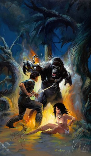 Editor: Ken Kelly’s “Monstrous” from 1989 looks like a paperback cover waiting to happen. The muscular hero confronting a monster, while a woman watches on... What stands out to me is the dynamic energy of the scene. What do you see in this piece? Curator: I see more than just a pulp adventure. Let's consider the broader cultural context of the 1980s. This painting, rendered in the fantasy genre, arrives amid anxieties about shifting gender roles and societal power structures. Note the hyper-masculine hero confronting what appears to be pure, animalistic aggression. Editor: Interesting! I hadn’t really thought about it like that. So, the hero is upholding traditional ideals, in a way? Curator: Precisely! But consider also the female figure, seemingly passive, observing this power dynamic unfold. She’s guarding something of value - perhaps something to be won by either the hero or the monster. The painting becomes less about simple good versus evil, and more about competing patriarchal forces. We are left to consider how gender plays into the conflict depicted here, as if womanhood is only there as the prize of men and their fights. Editor: That’s… definitely a different take than I had. So, it’s less about just a battle and more about who benefits from the battle? Curator: Exactly. And what narratives are reinforced by representing conflict in this way. Ken Kelly might’ve intended just fantasy escapism, but the artwork is inescapably linked to those larger conversations, no matter what. Editor: This has been a wild reinterpretation of something I had dismissed initially as lowbrow; I learned how fantasy reflects, even unintentionally, societal anxieties about gender and power. Curator: Indeed. Seeing beyond the surface is what makes art history such a vibrant field. This painting reflects societal structures and how power dynamics may still look the same after so much time has passed.