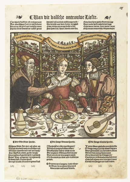 This is a woodcut with some color, made in the Netherlands around 1550. The anonymous artist represents a familiar theme in Early Modern Europe: unequal love. We see a well-dressed young man handing a bag of coins to an old woman, likely as payment for her affections. The image creates meaning through visual codes and cultural references that would have been easily understood at the time. The contrast between the youth and wealth of the man and the age and poverty of the woman is stark, highlighting the transactional nature of their relationship. The money chest in the background and the garments they wear are visual cues that signal social class. Such images served as commentary on the social structures of the time. They were critical of the moral decay that could result from economic inequality, as well as the power imbalances inherent in relationships based on money rather than genuine affection. As historians, we might consult period literature, legal documents, and economic data to better understand the social and institutional context in which this woodcut was made.