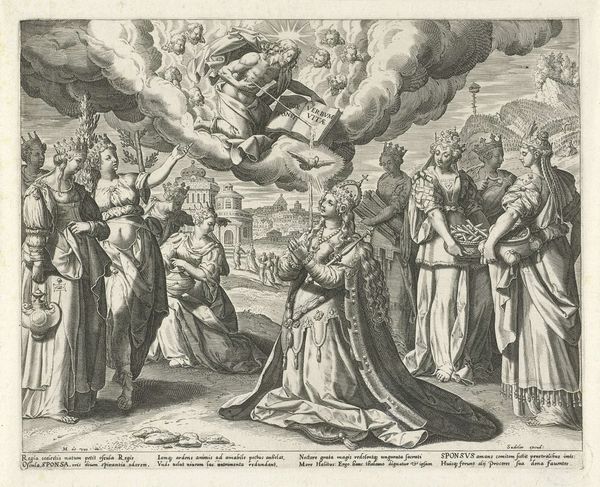 Curator: Here at the Rijksmuseum, we have a rather compelling 17th-century engraving. Made in 1643, this print, titled "Christus geeft zijn bloed aan zijn bruid," presents a detailed figuration of a bridal allegory in the baroque style. Editor: The sheer busyness of this piece is overwhelming. There are so many figures, textures, and patterns all fighting for attention, yet there's also a strange, ethereal beauty in it. Curator: Indeed. Notice how the composition is vertically divided into earthly and heavenly realms. The lower section presents the bride amidst a cohort of figures, all intricately detailed in their dress and posture. Above, Christ appears in a cloud of swirling figures, seemingly offering his blood. This upper zone contrasts with the more grounded perspective below through a more free use of open space, Editor: It’s pretty graphic though, right? A bit on the nose. That sanguine offering hovering over the bride seems more like a threat than a blessing. I am no art expert like you, but I can feel this much for sure, that this engraving may look very different for a person in the 17th century than it looks for me. Curator: It's important to contextualize the work within its time. Baroque art often embraced overt symbolism, and this piece serves as a vivid illustration of Christ’s sacrificial love, envisioned as a gift given to his bride, that is, the Church. Furthermore, the choice of engraving emphasizes clarity. Editor: Well, clear or not, those swirly clouds give me a head rush just looking at them. I can imagine a medieval audience taking great comfort in this image though: a sense of a powerful divine order amid their harsh lives. It's a real attempt to capture an awesome, terrifying sacredness in art. The dress and faces remind me of some fashion photos you may come across when casually scrolling on Instagram! I have got to give that the Anonymous artists really went full blast on the fashion statement side of things! Curator: It is also a testament to technical skill and careful artistry of printmaking to disseminate ideas and images. After analyzing the artwork, there is a clear purpose for the artist, in terms of symbolic intent, with great success, both thematically and in execution. Editor: For me, this piece is a visual tapestry reflecting religious fervor, technical ability, and historical fashion—with maybe a dash of unintended darkness.