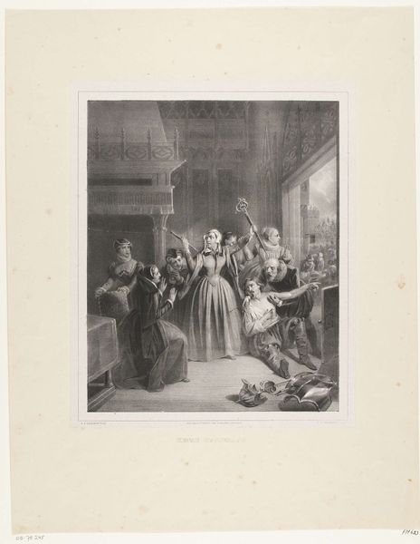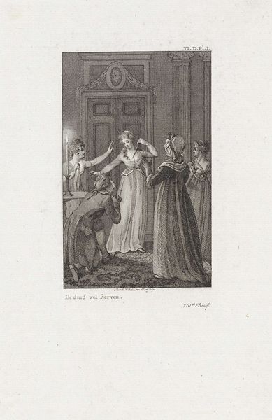 Editor: "Koningin in gesprek met een hofdame," or "Queen in Conversation with a Lady-in-Waiting," is an engraving made in 1774 by Jan Punt. It resides here at the Rijksmuseum. There's such dramatic energy radiating from this print—almost chaotic with the density of figures. Curator: Indeed. The density serves to concentrate our focus. Punt’s strategic use of line weights creates a deliberate hierarchy. Notice the contrast between the detailed rendering of the central figures and the more schematic depiction of the crowd. This creates a powerful sense of depth. Editor: Absolutely. I immediately pick up on the attire – those magnificent ruffs and puffed sleeves signify wealth and power, and perhaps subtly express rigid social structures. The setting suggests a pivotal moment in royal life, fraught with historical implications. Curator: Let's deconstruct that attire further. The interplay of light and shadow on the fabric’s folds imbues them with volume. Punt masterfully manipulates texture through varied hatching and stippling, giving the figures both weight and presence. Editor: I am curious about the symbolic exchange or interaction happening between the Queen and her attendant – there seems to be either an urgent warning or sharing of an important secret! How might contemporary viewers have read that moment? Curator: An intriguing observation. But consider the composition as a closed system. The Queen and lady-in-waiting create a clear central focal point, their arrangement adheres to certain principles that lead the eye without needing the specifics of the content. Editor: Still, these royal portraits and genre-based compositions offer invaluable portals into the mindset of the Baroque era. Punt preserves a moment, both intensely personal and decidedly political. Curator: The success here truly rests on Punt's ability to use very basic materials and compositional strategies to create something both arresting and intellectually engaging. Editor: In seeing it today, perhaps the value comes from what these symbols and depictions can reflect back at our own cultures, biases, and desires in relation to history, politics and hierarchy.