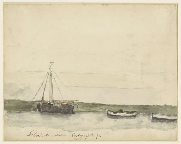 Curator: We're looking at R.A.C. Ziesenis’s "Coastal Scene with Sailing Ships and Church Tower," dating back to 1832. It’s a watercolor piece showcasing a genre painting in a landscape format. Editor: Wow, the light in this watercolor—it’s all soft edges and muted tones. Sort of melancholic, isn’t it? Like a memory fading at the edges, very wistful, very romantic! Curator: Precisely! It situates itself firmly within the Romanticism art movement, characterized by its emphasis on emotion, individualism, and the idealization of nature. The boats and the people are active, but the overall tone points toward introspection. Editor: Definitely gives you that yearning feeling. I'm thinking about who these little figures were, you know? The folks working at the harbor, just doing their daily routines, while that church tower keeps watch. A bit like stepping into someone else's dream of simpler times. Curator: The portrayal of genre-specific labor alongside symbols like the church is noteworthy here. Ziesenis presents us with a composition steeped in 19th-century Dutch society, referencing themes of national identity. How are those ideologies playing out? Whose labor is being recognized, and for what? Editor: That’s so interesting. It's crazy to think all that's packed into this tiny little piece of painted paper. I still get such a strong feeling of gentle sadness from it. Art, history, labor - what a combination! Curator: Yes. When you see art that blends genre with landscape painting, as with this Ziesenis piece, consider that it both reflects and influences society's values, norms, and power structures of its era. Editor: Food for thought. Next time I’m feeling glum I’ll look for church towers. Thanks for putting this beautiful little melancholic gem into perspective!