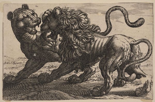Editor: Here we have Allart van Everdingen's "Reynard talks to the Lions and Cheetahs," a small etching. It looks like a fable scene. What do you make of this gathering of animals, particularly Reynard's role in it? Curator: It's fascinating to consider this through the lens of power dynamics. Reynard, the trickster fox, often represents the marginalized using cunning to navigate oppressive systems. How does this image reflect contemporary issues of social justice? Editor: So, Reynard could be seen as a symbol of resistance against established authority? Curator: Precisely. The assembled lions and cheetahs, symbols of power, are being addressed by the fox. We might ask: whose voices are typically silenced in such power structures, and how does Reynard's presence challenge that? Editor: That reframes my understanding entirely. It’s more than just a story; it’s a commentary on social hierarchies. Curator: Exactly! And it reminds us that art can be a powerful tool for interrogating the status quo.
