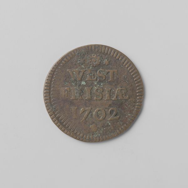 This is a copper Westfriese duit, crafted in 1739 by the governing body of West Friesland. Observe the circular form, a deliberate choice reflecting ideas of continuity and wholeness but also the physical requirements of currency. The raised lettering, arranged in a precise vertical hierarchy, spells out ‘WEST FRI’, then ‘SIAE’, and finally ‘1739’. This structured arrangement is disrupted by the floral emblems at the top, suggesting an interplay between regional identity and natural abundance. The worn texture of the copper provides a tactile history, each scratch a record of its circulation and exchange. Consider how the design’s structure and the materiality of the coin interact. The semiotic system encoded in the inscription communicates economic value and regional authority but the coin's very form invites reflection on the nature of value itself. The coin exists at a complex intersection of commerce, identity, and the passage of time, inviting us to reflect on how meaning is constructed through both deliberate design and incidental wear.