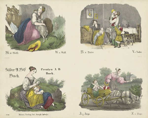 Editor: We’re looking at “Letters S, R, U en T” by firma Joseph Scholz, dating from 1829 to 1880. It's a series of watercolor illustrations, almost like pages from a children's book. There's a real charm to them, but what strikes me most is how ordinary they feel. How do you interpret this work? Curator: I see this as a fascinating document of its time, reflecting the material conditions of education and socialization. Consider the mass production of these images: what printing techniques were used to reproduce them and how did those techniques influence accessibility and distribution? It shifts our perspective, doesn't it? Editor: Definitely! I hadn't really thought about the means of production. So, rather than focusing on the artistic vision, we should examine it as a commercial product? Curator: Precisely. Think about the social function these images served. These weren’t precious paintings intended for a wealthy elite. What kind of paper was it printed on? How were they marketed? This artwork illuminates a specific moment in the history of material culture and consumption. And even beyond the explicit lesson being taught through the illustrations, are other implicit ones being passed down about class, or labor? Editor: That makes me think about the target audience, maybe a burgeoning middle class keen on educating their children? It's interesting to consider what values were being subtly communicated alongside the alphabet lessons. Curator: Exactly! The seeming simplicity of these images masks a complex web of social and economic relationships. It speaks volumes about the materials, labor, and consumption that defined 19th-century society. Editor: Wow, I'll never look at an alphabet book the same way again. Thanks, that really opened my eyes! Curator: And I think reflecting on how mass-produced materials impact both maker and audience, gives us a better idea of its place in the art world.