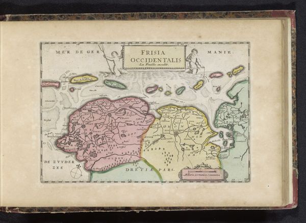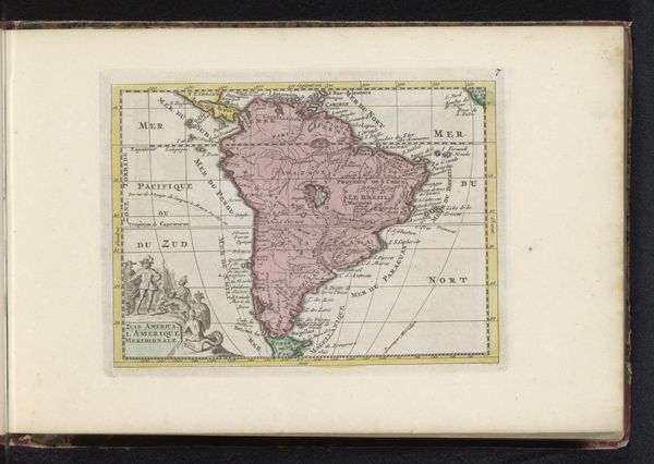 Curator: This map just zings with a peculiar sense of the possible. There’s so much empty space around a familiar shape. What do you think? Editor: There's a delicacy to it that's unexpected. Given what we know now, it feels…naive in a way that almost amplifies its beauty. I find the empty space…telling, as if they imagined terrible and magnificent things in the gaps of their geographical understanding. Curator: Yes, exactly! That potential, that “what if,” feels powerfully present. Now, this "Kaart van Afrika," created anonymously between 1700 and 1735, combines drawing and print on paper with watercolour details. The anonymous creator captures a view of Africa filtered through the lens of orientalism. What cultural assumptions do you see embedded here? Editor: The very act of mapping presupposes a kind of knowing, a possession even, that speaks volumes. I'm also struck by the shields adorning the sides - visual cues suggesting sovereignty, borders both declared and imagined. Notice the tiny vignettes, the costumed figures and what appears to be an ocean-going ship on the upper right side. They tell the history, not of the space, but how Europe met the space, literally filling Africa with European tropes. The continent itself becomes a projection screen for anxieties and aspirations. Curator: The detail along the coasts especially gives me pause, suggesting bustling trade routes or imagined treasures awaiting extraction, very colonial! And this peculiar choice of watercolors brings softness and washes it all with a somewhat utopian tone. Editor: Exactly. Maps, for all their apparent objectivity, are such subjective mirrors reflecting both the known and, perhaps more revealingly, the unknown. Here it gives space for us to rethink old patterns of colonization, to remember there is always the hidden, to learn we do not know it all even when a picture seems whole. Curator: Looking at it this way brings it to a very poignant level. Let's hope that in our future, it will give all an encouragement toward a world of respect.
