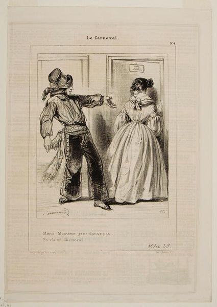 Curator: Honoré Daumier, a name synonymous with biting social commentary, offers us "The Streets of Paris in the First Days of September." Editor: There’s a lovely casual feel despite the formal attire; a snapshot of life, sketched with a knowing wink, wouldn't you say? Curator: Precisely. Daumier masterfully uses lithography to depict Parisian society. Observe the stark contrasts and exaggerated figures, all meticulously rendered. Editor: I’m drawn to the father carrying the child—such tenderness amidst the rigid social postures. It feels like a fleeting moment of humanity breaking through. Curator: And that's Daumier's genius. He captures not just appearances but also the undercurrents of class and emotion that defined his era. Editor: It is the type of work that allows us to peek into the past and realize we are not so different.