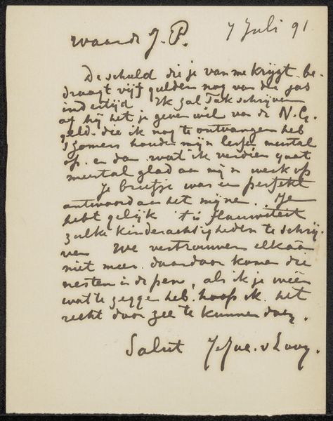 Curator: I'm drawn to this rather intimate piece: Fernand Khnopff's "Brief aan Philip Zilcken," an ink on paper work dating back to 1908. There's something immediate about its nature, wouldn’t you say? Editor: It’s like peeking into a private thought. The quick strokes, the slightly slanted script… it feels very personal and almost secretive. Like a fragment of someone’s inner world made visible. What significance might Zilcken have held for Khnopff? Curator: Well, Khnopff was, of course, deeply entrenched in the Symbolist movement. Letters, for Symbolists, often carried this double life, didn't they? As documents of mundane exchanges, but also vessels for complex emotional and intellectual content, imbued with almost mystical potential. Editor: Absolutely! You see that careful rendering of the letters themselves as almost talismanic forms. It transcends a simple message—it’s almost as though each word possesses an iconic charge. The handwritten nature especially infuses a very raw connection to both writer and addressee. What do you make of its sketch-like quality? Curator: That’s where it gets really fascinating. The rawness elevates that sense of intimacy. This wasn’t necessarily meant for public eyes in its current state, perhaps a study, or as some call it now, something discovered from an artist’s personal sketchbook, a little window into Khnopff’s artistic practice. I find it particularly captivating considering Khnopff’s reputation for very stylized portraits. Editor: Precisely, the very choice of ink as a medium links back centuries, echoing monastic traditions of illuminated manuscripts, where text became intertwined with devotional art. Is Khnopff elevating simple correspondence to something more profound? Curator: Maybe so, or maybe, just maybe, it's merely a sincere expression penned with genuine feeling, no overthought conceptualization muddling the authenticity! Still, considering that Khnopff was so deliberate in most of his work, even this sort of raw gesture feels like part of a carefully constructed identity. Editor: It begs the question: could true spontaneity even exist within Symbolism? Everything felt so self-aware and calculated. Perhaps that tension is exactly what makes it interesting. Curator: Right! The letter encapsulates a feeling; an instant where thought transitions into physical expression, while simultaneously inviting us into a quiet, intense conversation across time. Editor: A perfect meeting point, truly. And isn't that why we're so often captivated by such fleeting, yet indelible testaments?