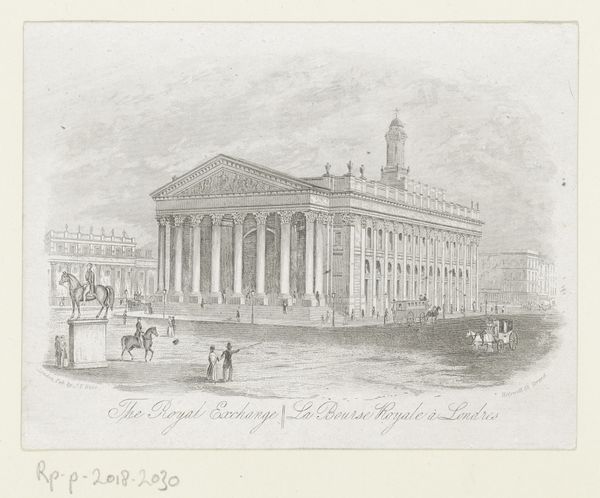Curator: This print from 1828, “Gezicht op het Palais Bourbon te Parijs”, by Jules David, gives us an intimate view of Parisian civic life in the early 19th century. It's an engraving. Editor: Wow, there is such austerity in the geometric rendering! The stark contrast between the imposing, classical facade and the rather grainy activity in front feels strangely poetic. I imagine the artist, obsessing over the angle and trying to figure out how to capture the texture with his graver. Curator: Well, what’s interesting about engravings is the reproductive labor involved; many were printed, and therefore, it was circulated as a visual product for wide audiences. It suggests an emergent Parisian middle class consuming images of political power... of national identity itself. Editor: It also reminds me a bit of those old photographs. They kind of pull you in with an alien world in a recognizable present! Though, seeing the horsedrawn carriages and figures almost frozen in time, there’s a hint of the everyday… Curator: Exactly! Consider how Jules David is trying to represent Neoclassicism as a dominant mode of architectural representation… And look at all these tiny details in the engraving. They speak volumes about material and production, you know? From the quality of the paper, the depth of the cuts to the ink used, it makes this more than just a scene! Editor: Right. More like an objectified scene… It does have that feeling! Although cold, that might be something else too! Like how we try to grasp power through images, rendering it visible, even collectible… Do you think the precision allows some kind of emotional barrier too, hiding a deeper perspective or social critique behind perfection? Curator: Precisely! By replicating existing power dynamics and modes of urban circulation in Parisian life, prints played a pivotal role in shaping understandings of state and citizenship, of social position within city landscapes... It becomes like an urban dream itself! Editor: And yet, the whole thing manages to retain a curious energy. Almost dreamlike... That's the enduring mystery, isn't it? The convergence of a social-historical project and its interpretation by creative soul?