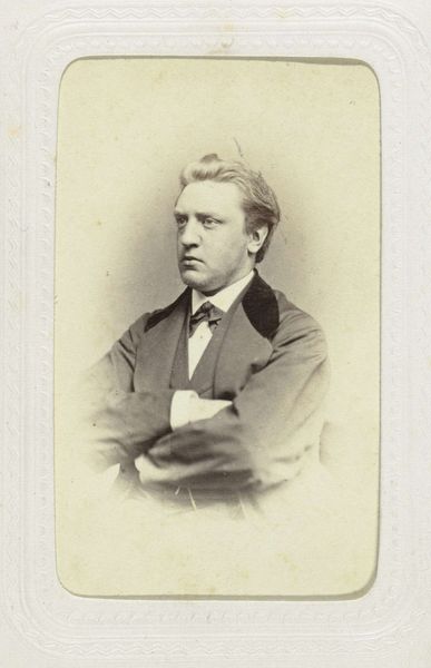 Editor: Here we have “Studioportret van een man in kostuum,” or “Studio Portrait of a Man in Costume,” created sometime between 1863 and 1866, by Albert Greiner. It’s a daguerreotype, a very early form of photography. It strikes me as… surprisingly modern, despite its age. What stands out to you about this portrait? Curator: What strikes me is how carefully the sitter’s image has been constructed. A three-piece suit, a carefully chosen pose... These aren't accidental choices. Every element contributes to a visual language intended to project respectability, and, perhaps, a subtle ambition. Think about what those symbols mean today versus then. Editor: So the clothing acts almost like a… uniform, conveying social status? Curator: Precisely! Clothing, particularly in a portrait like this, isn’t just fabric; it's a statement. The bow tie, the vest, the jacket – each a deliberate choice, reinforcing societal expectations for men of that era. Look at the way he deliberately avoids our gaze: what is he communicating, or concealing? Editor: It makes you wonder about the man beyond the image. Curator: Absolutely. It's an interesting exercise to consider the performance involved, both by the sitter and, to a degree, by the photographer themselves in constructing this image. Also the *intended* audience… and how that factors in to what “stories” it might communicate, and why. Editor: That gives me a lot to consider! Thank you. Curator: My pleasure. Remember, images always whisper secrets, reflecting both conscious choices and the spirit of the times.