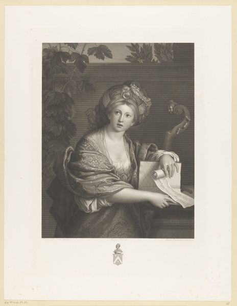Editor: This is Antonio Perfetti's "Sibilla Cumaea." I'm drawn to the subject, a woman holding a scroll, but I'm not familiar with the cultural context. What do you see in this piece? Curator: The Sibyls were female figures in antiquity believed to possess prophetic abilities. Perfetti, by depicting her in such a way, is participating in a long history of representing female knowledge. Why do you think he chose to depict a Sibyl, and what does it say about his views on women's knowledge? Editor: Perhaps to legitimize female wisdom within a male-dominated intellectual landscape? Curator: Exactly! And it's worth considering how this representation might have been received, and even challenged, within its own historical context. Editor: Interesting, this really frames the artwork through the lens of gender dynamics and intellectual history. Curator: Precisely, seeing art as an active participant in cultural conversations.