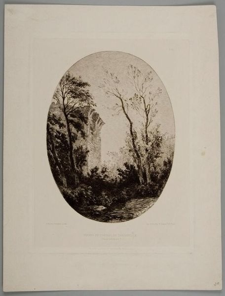 Curator: Looking at this print, "Ruins of the Chateau of Tancarville" by Alfred Louis Brunet-Debaines, I’m immediately struck by its evocative moodiness. Editor: I see that too. It makes me think about who built this chateau, how they lived and what power structures were at play at the time. Curator: Exactly, and it’s fascinating to consider the labor involved in both its construction and eventual decay. The print itself, the etching process—the acid, the plate, the paper—all speak to a specific mode of production and consumption of imagery. Editor: Absolutely. The ruin becomes a potent symbol of shifting social dynamics and the impermanence of power, reminding us that even the grandest structures are subject to historical forces. Curator: Yes, and Brunet-Debaines, in choosing this subject, directs our gaze not just to the aesthetic of decay but also to the underlying material conditions that facilitate such transformations. Editor: It gives a new depth to our understanding, doesn't it? It highlights the human stories embedded in both the stones and in the artistry.