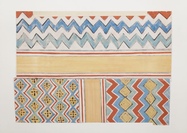 Louie H. Ewing created this lithograph, Plate 15, sometime in the mid-twentieth century. It's a feast for the eyes through its clever use of pattern and color. It makes me think about how the act of art-making is really an act of problem-solving. Look at the textures and colors - that sandy ground, that soft pink. The interplay of these shades evokes a landscape. But it’s not really trying to be a landscape, right? The longer I look, the more I think about weaving. How the horizontal lines mimic threads pulled tight on a loom. I'm really interested in the imperfect quality of the printing. See how the colors don’t always line up perfectly within the zigzags? This isn’t just a surface decoration; it’s a whole visual language, much like the work of Anni Albers, where the grid becomes a space for improvisation and experimentation. Ultimately, this lithograph feels like an open-ended question, inviting us to consider the possibilities of abstraction, and the conversations that art has across time.
